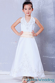 V-Neck A-Line Long Embroidered Sleeveless Bow Satin First Communion Dress